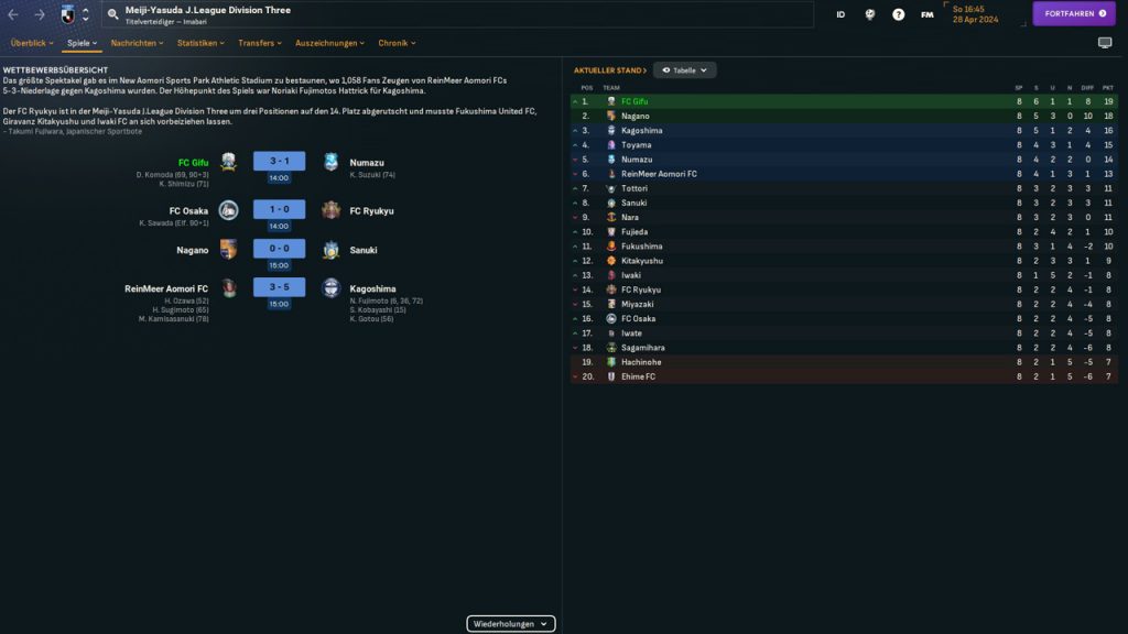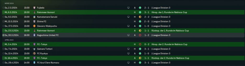 Dass uns Stürmer Ukita nach seiner Verletzung zum Ende der Vorbereitung fehlte, macht sich nicht so negativ bemerkbar wie befürchtet. Wir spielen wirklich sehenswerten Offensiv-Fußball, haben 17 Tore in den ersten 8 Ligaspielen erzielt. Vor allem unsere Flügelspieler treffen. Bei unserer einzigen Niederlage in der Liga waren wir zudem ab der 29. Minute in Unterzahl, konnten trotzdem gut mitspielen.