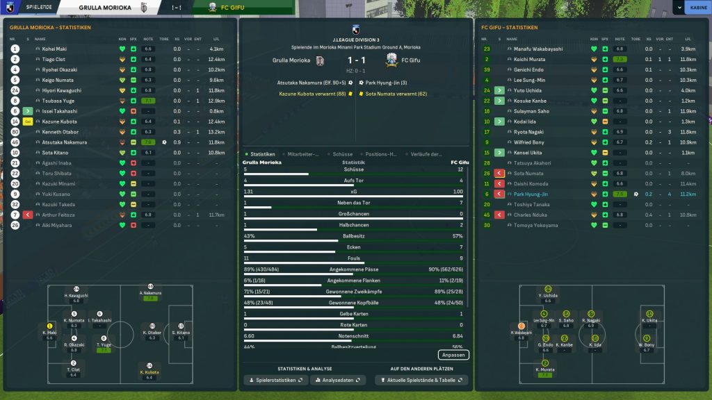 Konkurrent Gainare Tottori legte mit einer Niederlage vor. Es musste also nur ein Sieg her. Doch trotz einer frühen Führung nach nur drei Minuten machten wir bei Grulla Morioka kein gutes Spiel. Wir blieben zu passiv, erspielten uns zu wenig Chancen. In der 5. (!) Minute der Nachspielzeit brachte uns dann ein umstrittener Elfmeter um den Sieg.