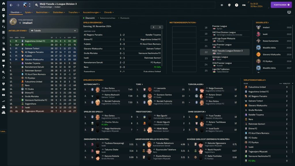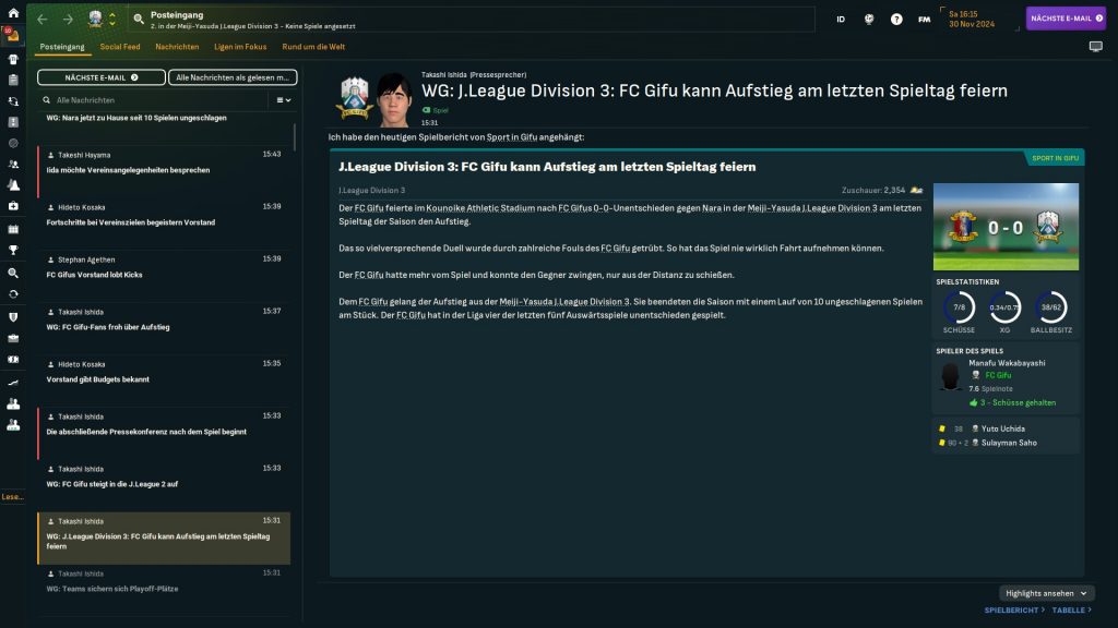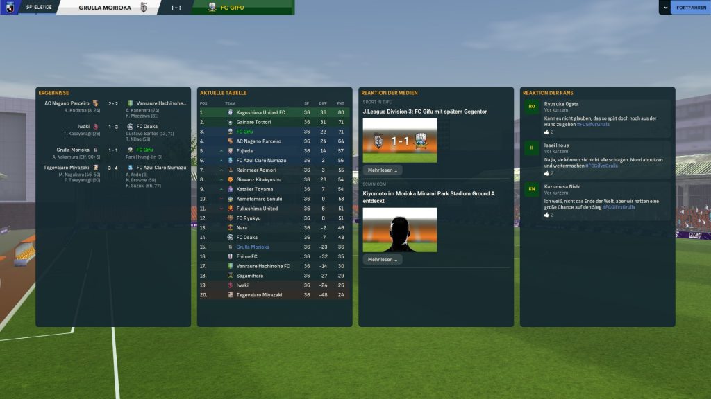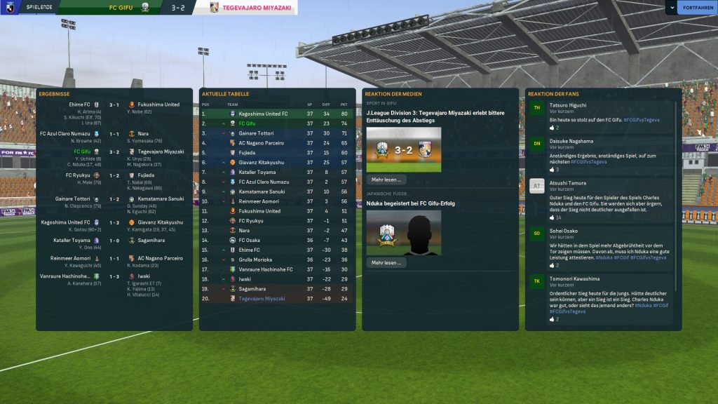 Am nächsten Spieltag fanden die Begegnungen parallel statt. Und Tottori zeigte erneut Nerven, verlor mit 1:2. Und wir? Gegen den Tabellenletzten und die Schießbude der Liga ließen wir uns völlig unnötig auf ein wildes Spiel ein. Doch zum Glück hatten wir das bessere Ende auf unserer Seite. Mit einem 3:2-Heimsieg kletterten wir auf den zweiten Platz.