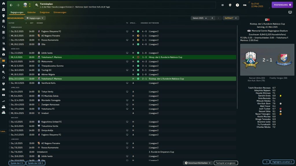 Doch die Mannschaft steckt das bislang hervorragend weg. Im Pokal gab es Auswärts bei den höherklassigen Marinos aus Yokohama die einzige Niederlage (im Rückspiel schnupperten wir mit einem knapp Sieg sogar an einer Sensation). In der Liga läuft es besser, als ich mir je hätte erträumen lassen. Wir sind noch ungeschlagen und schießen vor allem reihenweise Tore. So kann es weitergehen.