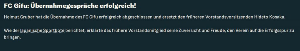 ich bleibe vorerst beim FC Gifu. Der alte Vorstandsvorsitzende, mit dem ich ja so meine Probleme und Differenzen hatte, ist weg. Mit Helmut Gruber übernimmt sogar ein Landsmann von mir die Geschäfte. Er war bereits länger Teil des Vorstands, hat angeblich dafür geworben, mir überhaupt erst die Chance als Trainer zu geben.
