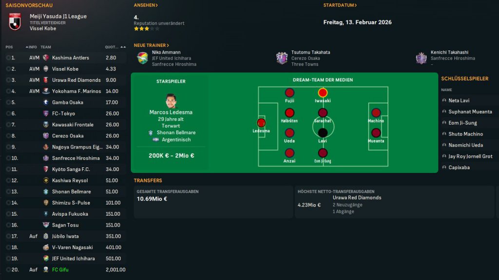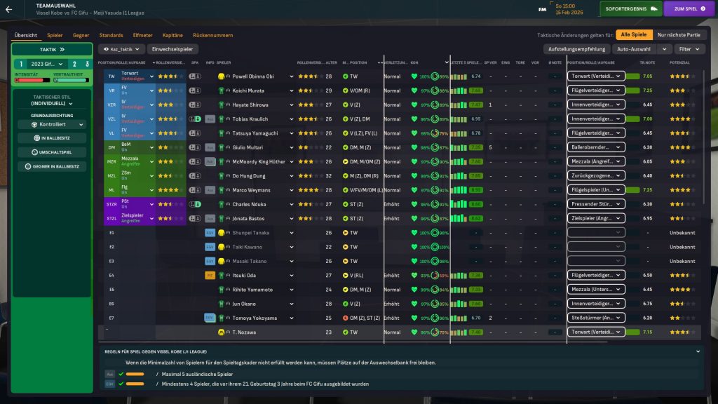 Im Endeffekt gingen wir so mit nur drei richtigen Wechseloptionen (Stürmer Yokoyama hat auch nicht das nötige Niveau, sitzt nur auf der Bank, weil er ebenfalls ein im Klub ausgebildeter Spieler ist) in unser erstes Spiel in Liga 1.