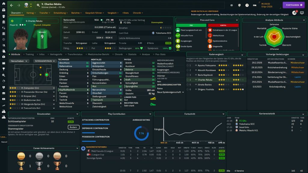 Einen Spieler muss ich besonders feiern. Charles Nduka ist einer der wenigen Spieler, die schon vor meinem Amtsantritt hier waren und hält sich seitdem konstant in der Mannschaft. Diese Saison wurde er schon vier Mal zum Spieler des Spiels gewählt, hat aktuell den besten Notenschnitt in der Liga. Beeindruckend.