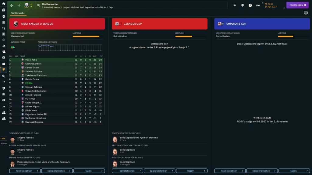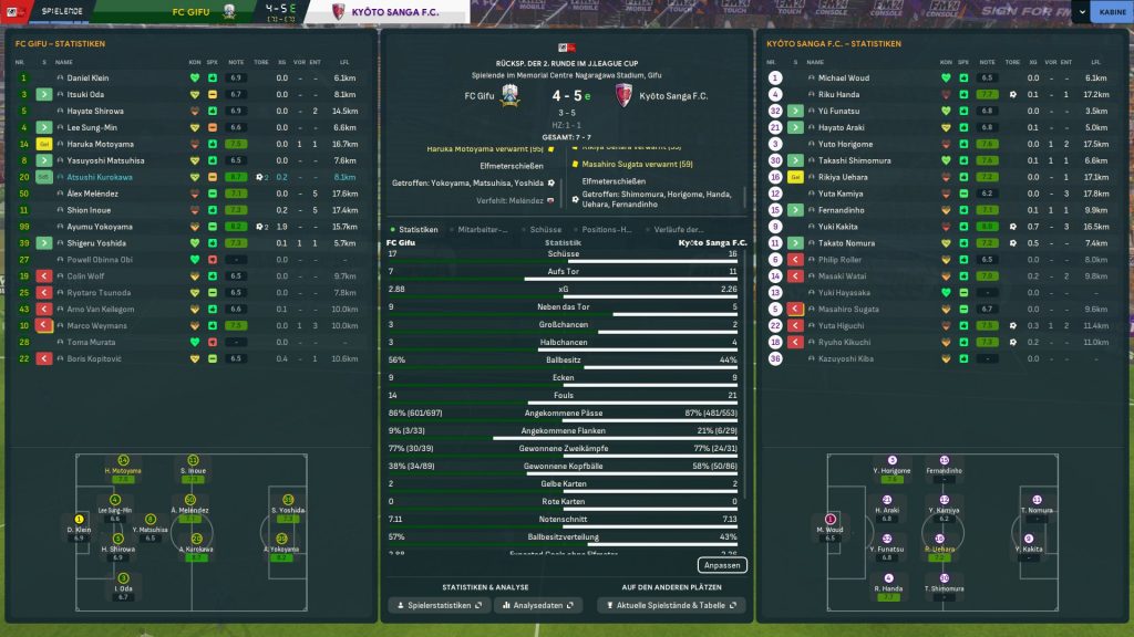 enge Pokalduelle gegen Kyoto Sanga F.C. werden hier langsam zu einer Tradition. Dieses Mal dauerte es aber nicht bis ins Halbfinale (im Vorjahr gab es ja sogar zwei gegen den Konkurrenten), sondern wir trafen schon in der 2. Runde im J.League Cup aufeinander. Wieder war es eine enge Kiste über zwei Spiele mit vielen Toren und vor allem einem Elfmeterschießen zum Abschluss. Leider gab es nicht das beste Ende für uns. Wir verabschieden uns schon früh aus dem Liga-Pokal.