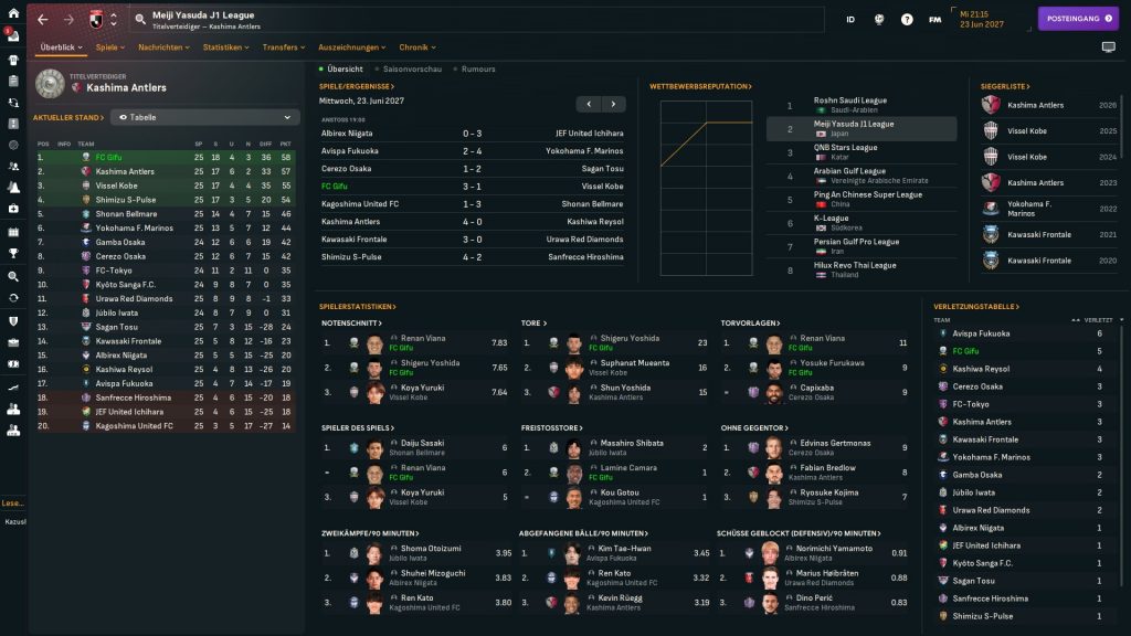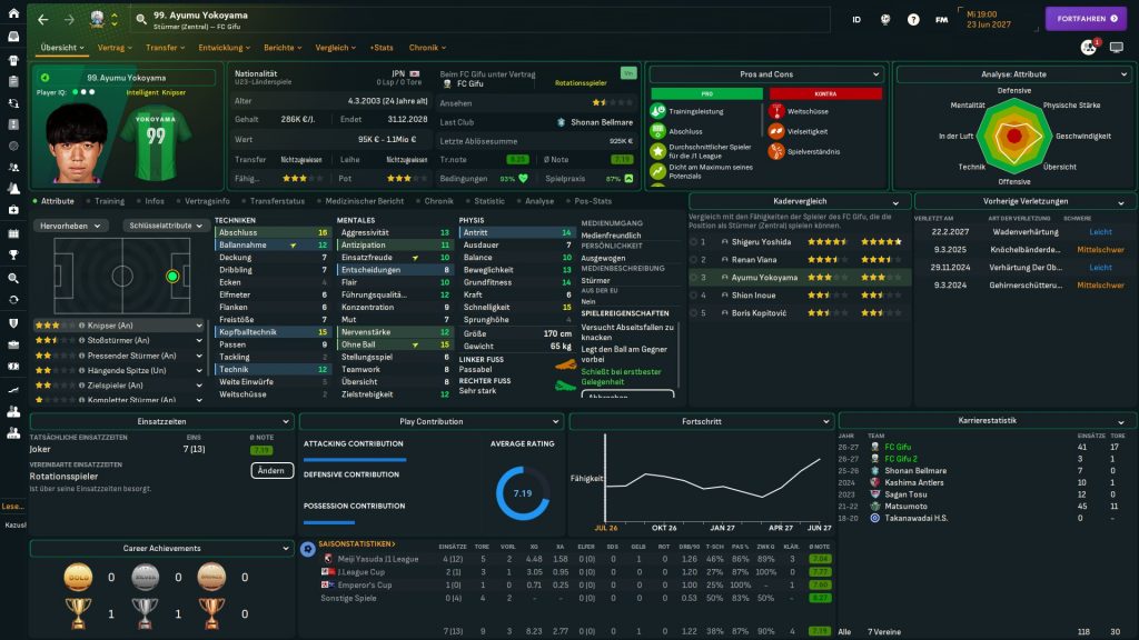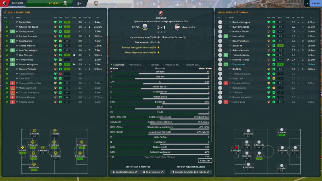 Dabei stach ein Spieler heraus, der diese Saison nicht die ganz große Rolle spielt. Ayumu Yokoyama wurde von mir einst als mögliches Supertalent geholt, doch Shigeru Yoshida hat ihm den Rang abgelaufen. Er ist nun meist sein Ersatz für jene Spiele und Spielphasen, in denen ich das 18 Jahre alte Top-Talent schone. Doch aufgrund einer Verletzung von Renan Viana rutschte er in die erste Elf und erzielte die entscheidenden Treffer zum 1:1 und zum 2:1.