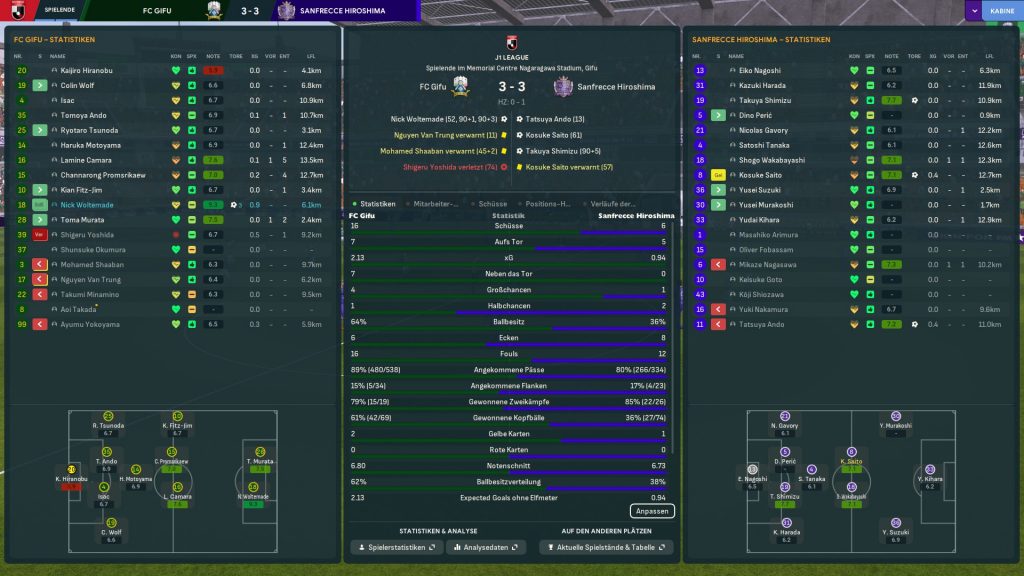 Der eigentlich nach anstrengenden Wochen geschonte Woltemade dreht als sein Ersatz mit einem Hattrick das Spiel. Nach seinen Treffern Nr. 2 & 3 in der Nachspielzeit scheinen wir mit einem blauen Auge davon zu kommen. Doch durch ein drittes Tor (aber dieses Mal von Hiroshima) in dieser verrückten Nachspielzeit kassieren wir auch noch den Ausgleich.