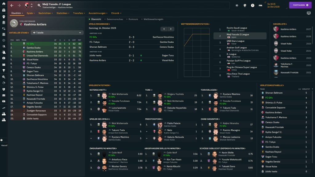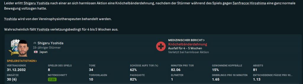 wie optimistisch war ich vor etwas mehr als einem Monat, nachdem wir die Kashima Antlers mit 4:0 in der Liga besiegten. Doch wir haben unseren 9-Punkte-Vorsprung nun fast verspielt. Nach einer Niederlage zuletzt lagen wir vor dem heutigen Spieltag nur noch drei Punkte vor Gamba Osaka. Das Spiel gegen Hiroshima ist so ein Pflichtsieg. Doch wir gehen früh in Rückstand, verlieren dann auch noch Starstürmer Yoshida durch eine Verletzung. Er wird uns nun für rund einen Monat im Meisterschaftskampf fehlen.