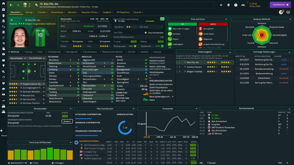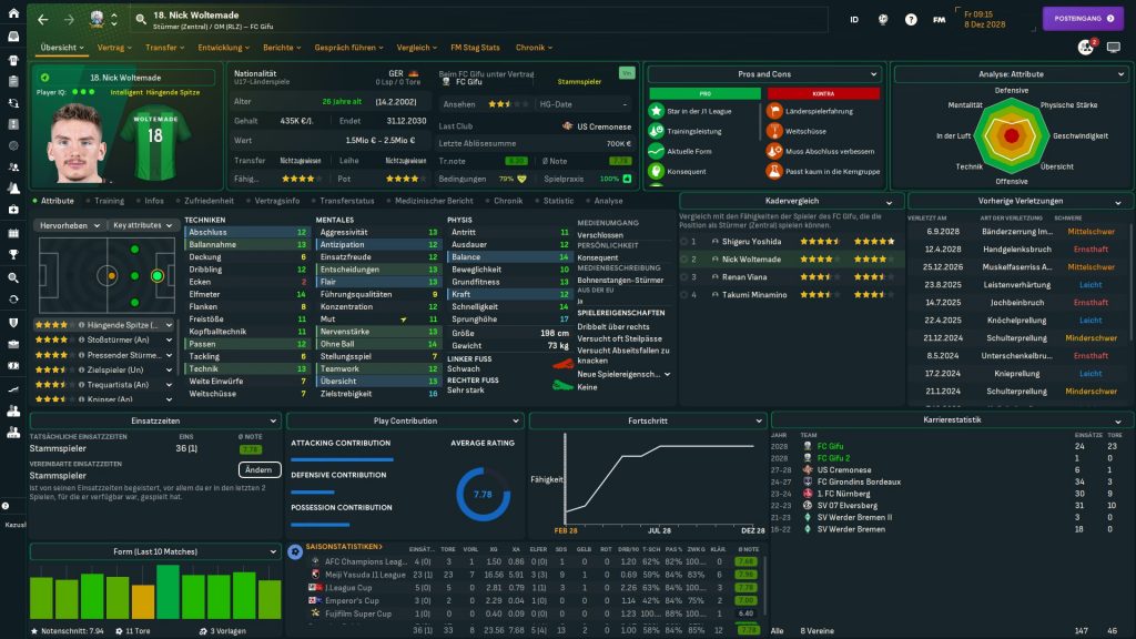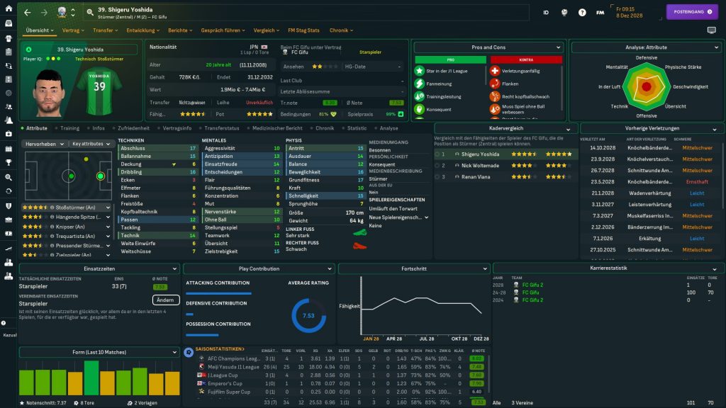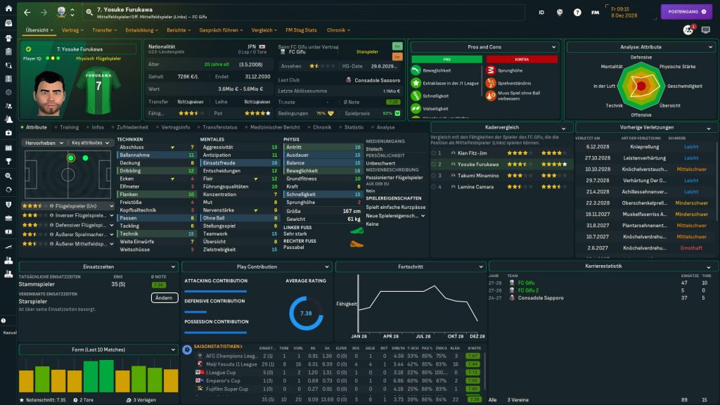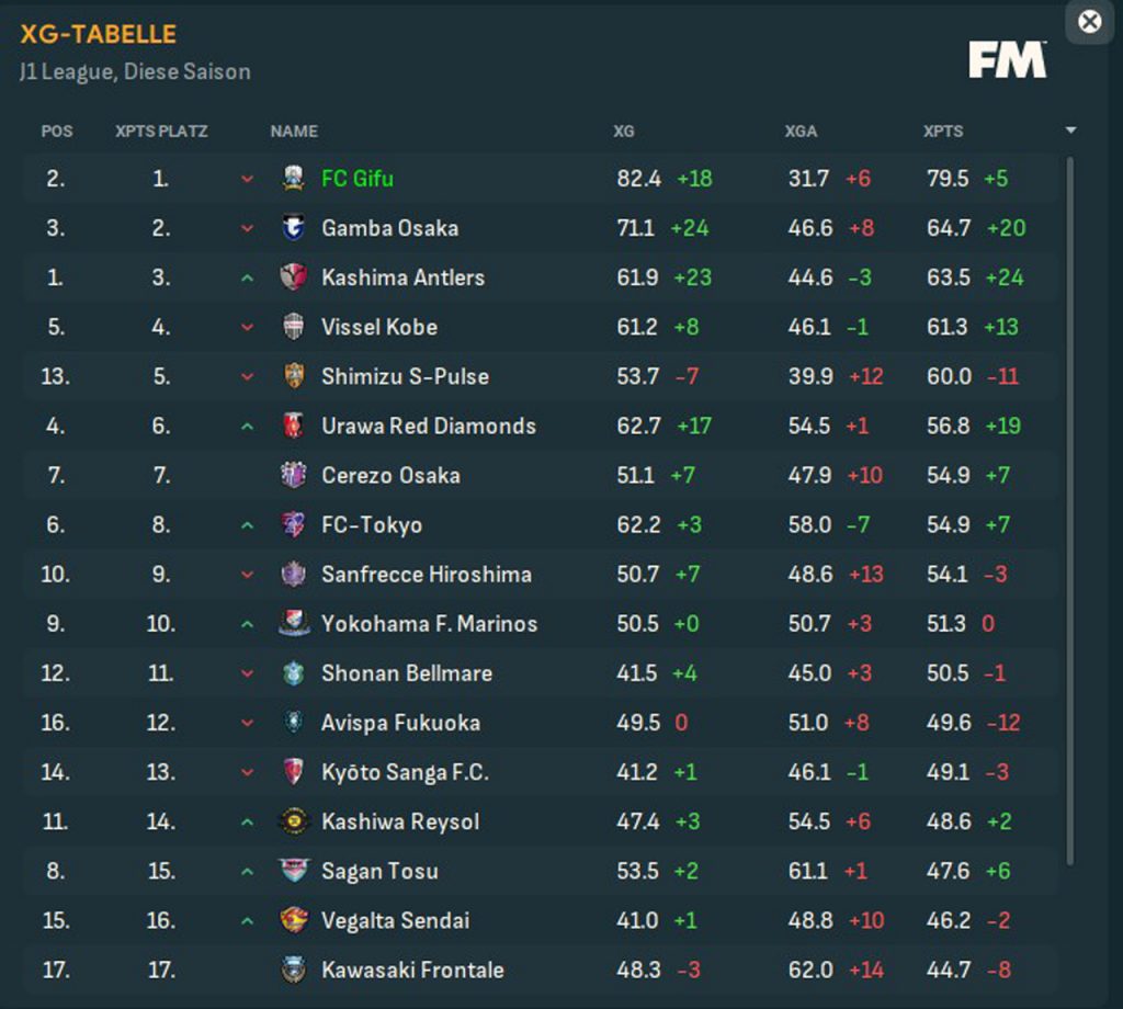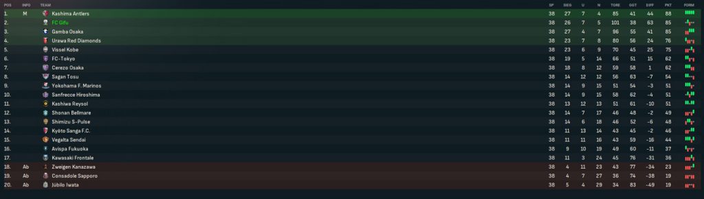 Auch wenn nicht alles geklappt hat, bin ich sehr stolz auf diese Mannschaft und auf einige der besten Spieler. Kaijiro Hiranobu ist ein herausragender Keeper, hielt in der Liga in 18 Spielen seinen Kasten sauber. Vorne schossen Shigeru Yoshida und Nick Woltemade um die Wette. 34 bzw. 33 Treffer standen am Ende zu Buche. Aber auch Renan Viana beeindruckte in seiner neuen Rolle als Ersatz. 14 Treffer in 5 Vorlagen in nur 23 Einsätzen (davon einige von der Bank) sind sensationell. Hervorheben muss ich unbedingt noch Mittelfeldlenker Kian Fitz-Jim, der mit 14 Assists die zweitmeisten Tore vorbereitete (noch übertreffen von Flügelspieler Yosuke Furukawa mit 20). Vor allem spielte er aber so viele geniale, den Raum öffnende Pässe…