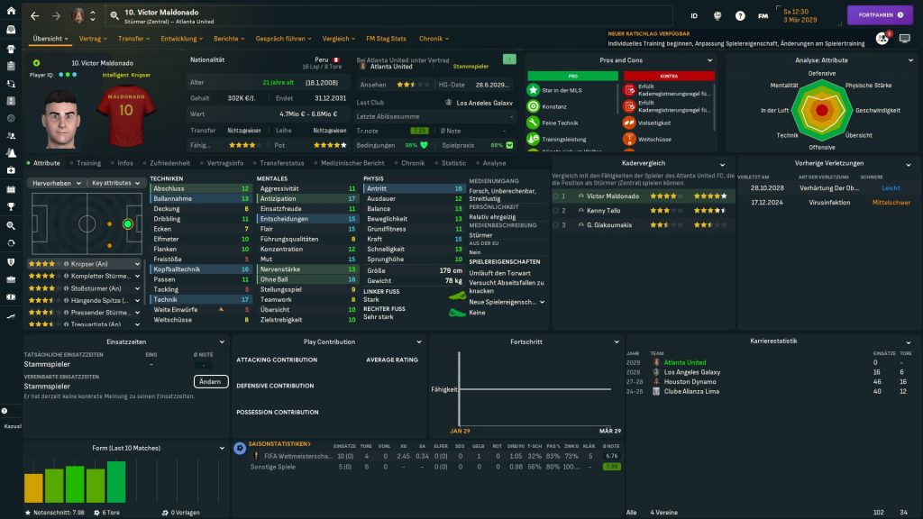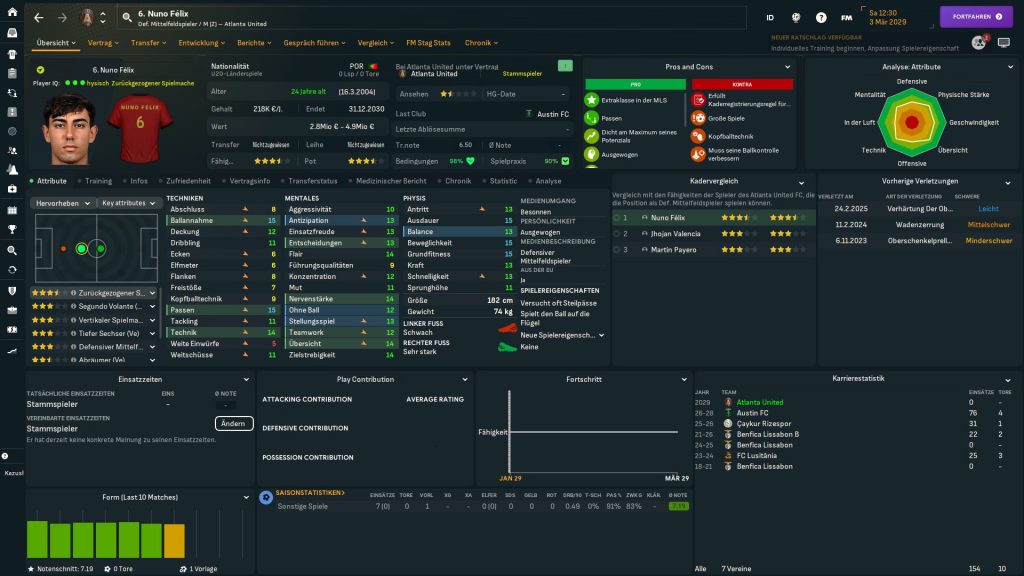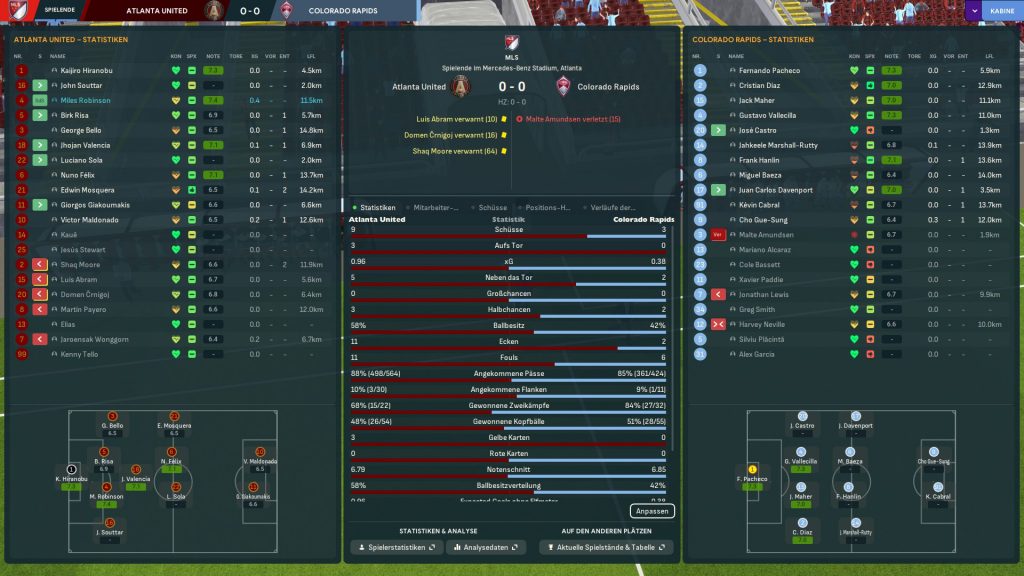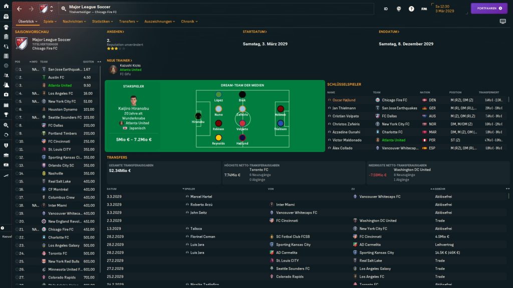 Ich konnte derweil noch zwei Spieler durch MLS-Trades holen: Victor Maldonado kommt von Los Angeles Galaxy. Der gerade erst 21 Jahre alte peruanische Nationalspieler soll nun vorne die Tore schießen. Der von Austin FC geholte Nuno Félix wird derweil unser neuer Spielmacher auf der 6. Abgeben musste ich dafür jeweils künftige Draft-Picks, wovon wir allerdings einige haben, da mein Vorgänger hier sehr viele erworben hat.
