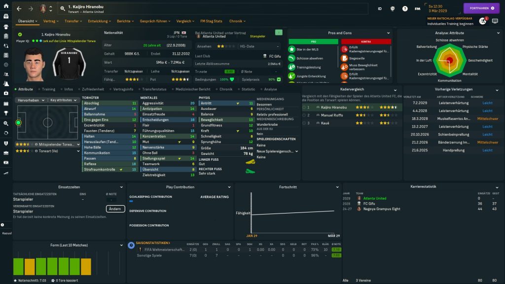 Mit mir und Zlatan auf dem Trainingsplatz stehen natürlich auch einige neue Spieler, wobei ich mich da zuerst bei den Fans meines alten Teams entschuldigen muss. Denn um das Torhüterproblem zu lösen, fiel mir direkt ein Name ein: Kaijiro Hiranobu! Und da ich über seine niedrige Ausstiegsklausel wusste, konnte ich den 20 Jahre alten, dreifachen japanischen Nationalspieler für nur umgerechnet 2,5 Millionen Euro holen – aber: Ich habe gar nicht bemerkt, dass der Transfer bereits zum 1. Januar vollzogen wird – und das ist ja genau der Tag, an welchem das so komisch mitten in der Winterpause angesetzte Finale des japanischen Pokals stattfand. So musste mein altes Team ohne Hiranobu antreten … und verlor prompt 1:2 nach Verlängerung durch einen katastrophalen Fehler des nun natürlich zwischen die Pfosten gerückten Ersatzkeepers. Sorry…