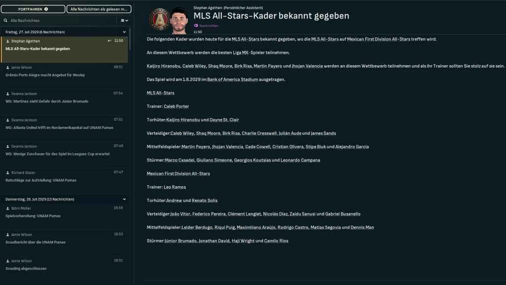 heute konnte ich mal ganz entspannt ein Spiel im Stadion anschauen. Das MLS-All-Star-Game stand auf dem Programm – und es wurde von Atlanta United geprägt. Erst einmal wurden insgesamt sechs meiner Spieler nominiert.
