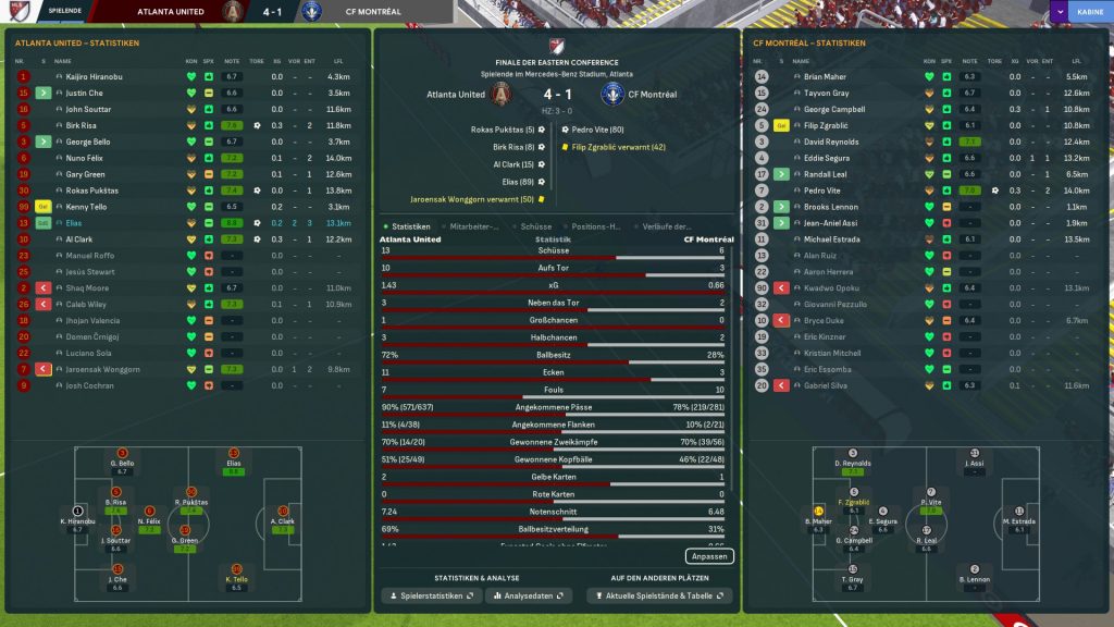 Danach ließen wir es ruhiger angehen – gen Ende zu ruhig. In der 80. Minute kassierten wir so, dass 3:1. Doch Elias, der mit zwei Vorlagen ohnehin schon der stärkste Mann auf dem Platz war, beseitigte mit einem feinen Dribbling jegliche Hoffnungen von Montréal, hier ein Wunder zu schaffen und stellte den 4:1-Endstand her.
