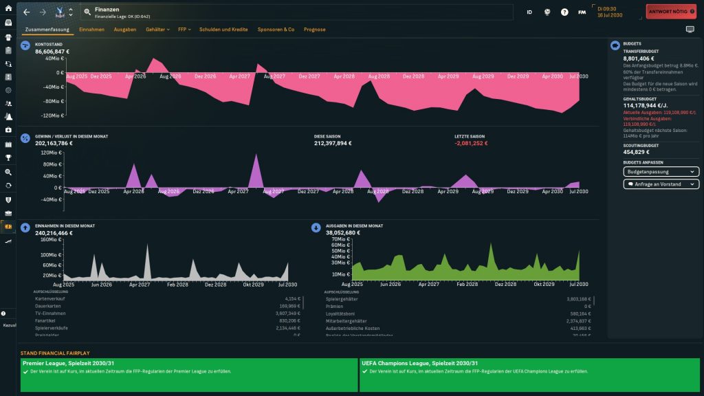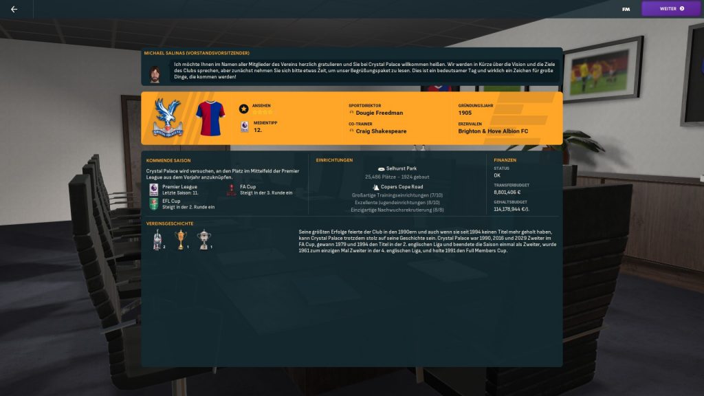 Trotzdem sind die sportlichen Ziele hoch angesetzt. Es soll mindestens ein einstelliger Tabellenplatz erreicht werden. Das gelang dem Verein seit dem Wiederaufstieg in die Premier League im Jahr 2013 nur ein einziges Mal (8. Platz 2025). Spätestens in der Saison 2032/2033 will man um einen nationalen Pokalsieg mitspielen (was immerhin meinem Vorgänger Frank 2029 mit dem zweiten Platz im FA Cup beinahe gelang).