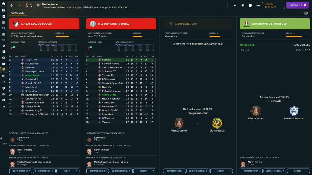 Ich denke, ich übergebe den Verein glänzend aufgestellt. Wir liegen in der Tabelle zwar nur auf dem 5. Platz der Conference und auf dem 10. Rang insgesamt. Durch unseren Champions-League-Lauf so wie viele Nationalspieler-Abstellungen wurden aber zahlreiche unserer Spiele verschoben. Wir haben daher 6-8 Partien weniger bestritten. Mit nur fünf Punkten aus den Nachholspielen ist das Team schon wieder Spitzenreiter in der (in diesem Jahr aber deutlich schwächeren) Eastern Conference.