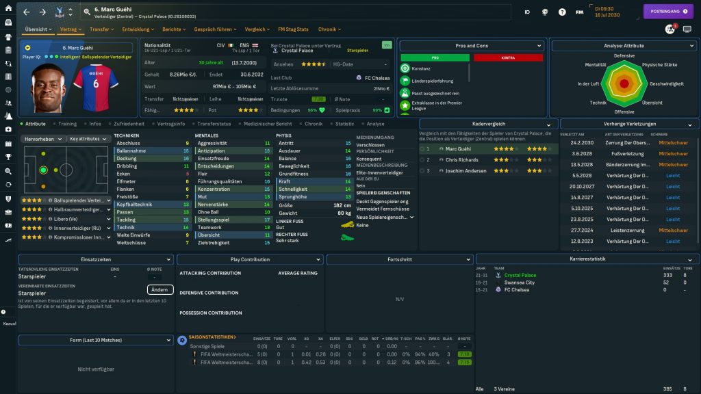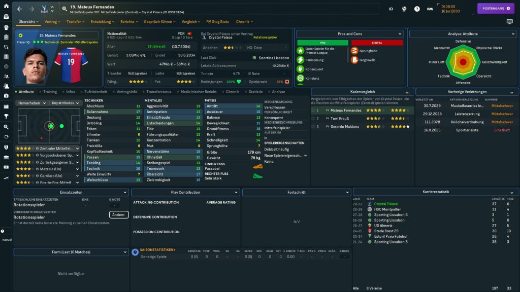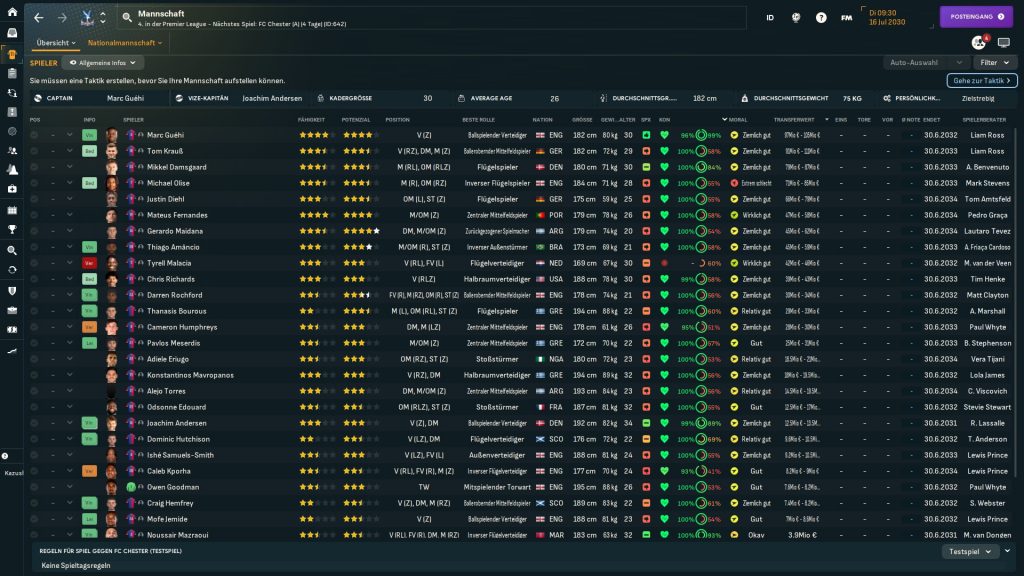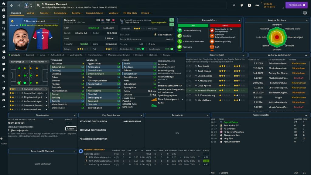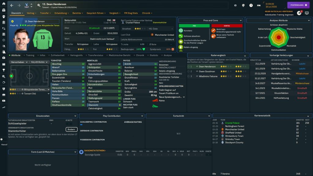 Andere Spieler werden dafür hoffentlich gehen. Noussair Mazraoui wurde 2028 für 25 Millionen Euro von Real Madrid geholt, verdient vier Millionen und hat hier nie Eindruck hinterlassen. Man darf zweifeln, ob er noch das Niveau für die Liga hat. Auch Keeper Dean Henderson hat sicher große Verdienste für den Verein. Dass er seit Jahren sehr maue Durchschnittswertungen zwischen 6,3 und 6,7 sammelt, lässt mich aber daran zweifeln, ob er unser Stammkeeper sein sollte.