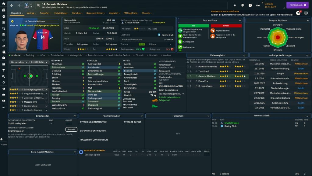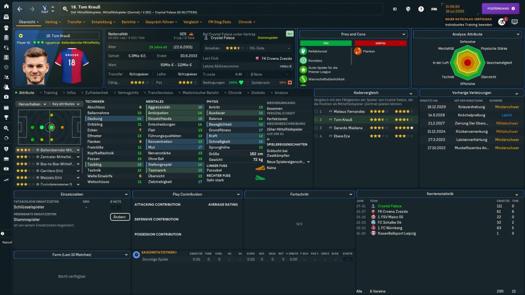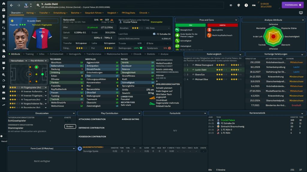 Zuerst werden wir den vorhandenen Kader analysieren. Zu diesem gehören auch zwei deutsche Landsmänner. Der Ex-Schalker und -Mainzer Tom Krauß hat es bei Palace sogar zum dreifachen Nationalspieler gebracht und wird mit rund 100 Millionen Euro Marktwert taxiert. Auch der aus der Kölner Jugend stammende Justin Diehl hat mit 168 Einsätzen für den Club hier schon eine lange Geschichte. Einige Spieler wollen weg, um in Champions-League-Vereinen zu spielen.