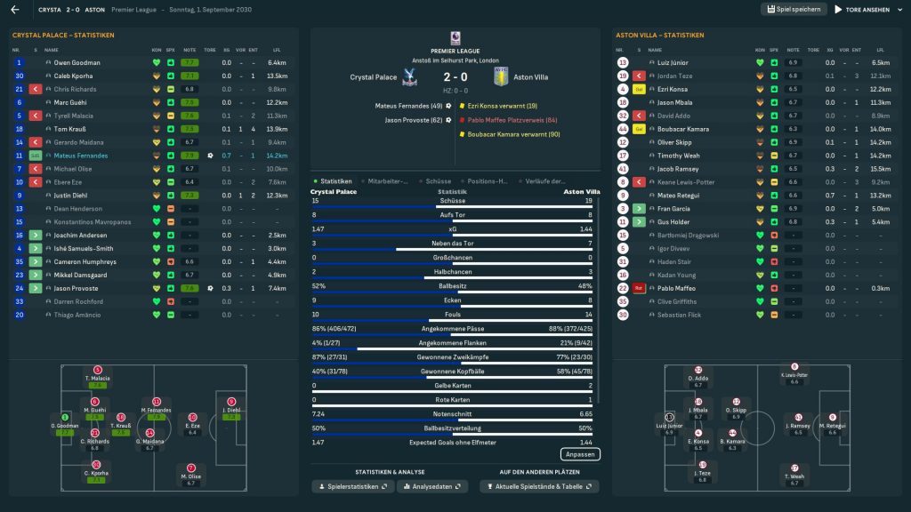 nach zwei Unentschieden und einer Niederlage in der Liga sowie einem Ausscheiden im EFL Cup kann ich mit einem 2:0 gegen Aston Villa den ersten Sieg in meiner Karriere als Trainer bei Crystal Palace feiern: