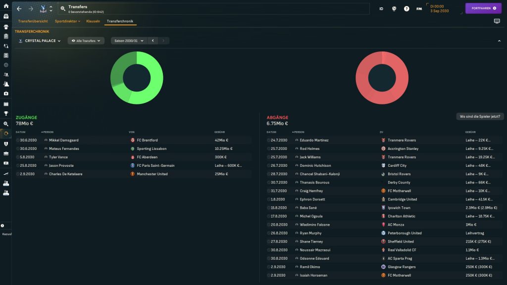 Hier ist nun die komplette Transferübersicht mit den Zugängen meines Vorgängers und noch ein paar Abgängen: