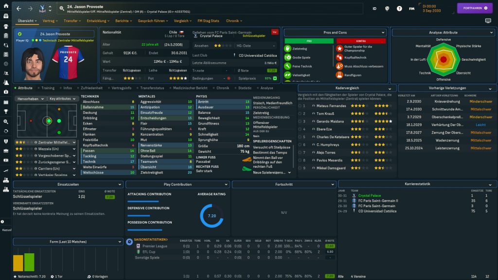 Für 25 Millionen Dollar kommt am heutigen Deadline Day von Manchester United Stürmer Charles De Ketelaere. War bei ManU meist Joker, ich glaube, dass er mit seinen 1,92 Meter uns benötigte Körperlichkeit im Sturm beschert. Bereits seit einer Woche im Club ist Jason Provoste. Den jungen, hochtalentierten Chilenen konnten wir günstig von Paris Saint-Germain leihen, haben zudem eine mit 14 Millionen Euro moderate Kaufoption. Feierte einen glänzenden Einstand mit einem Tor im ersten Spiel. Seine Hauptaufgabe wird aber, diese vorzubereiten. Kann dafür beide 8er-Rollen wie auch die 10er-Position in unserem System einnehmen.