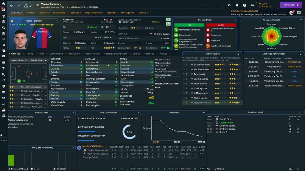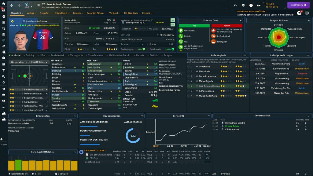 - José Antonio Corona ist ein Abräumer vor der Abwehr, den ich aktuell in die Championship verliehen haben, wo er Stammspieler gute Leistungen zeigt. Soll nach seiner Rückkehr zum Backup hinter Tom Krauß und dann zum Nachfolger des zuverlässigen Deutschen aufgebaut werden.