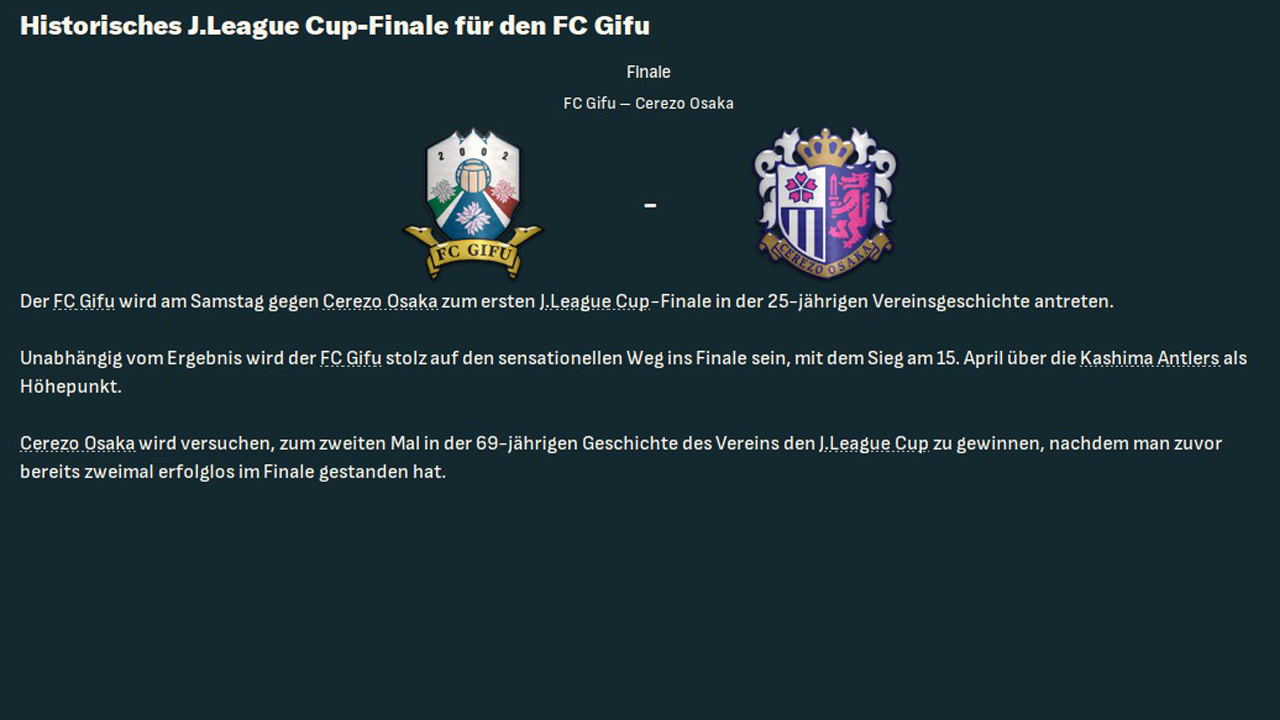 Liebes Tagebuch, es war ein historischer Tag. Zum ersten Mal in der Vereinsgeschichte stand der FC Gifu in einem Pokalfinale. Im J.League-Cup ging es gegen Osaka und wir begeisterten mit einer tollen Offensivleistung. Wir waren über weite Strecken überlegen, spielten auf das gegnerische Tor – doch mehr als ein Treffer von Stürmer Viana nach toller …